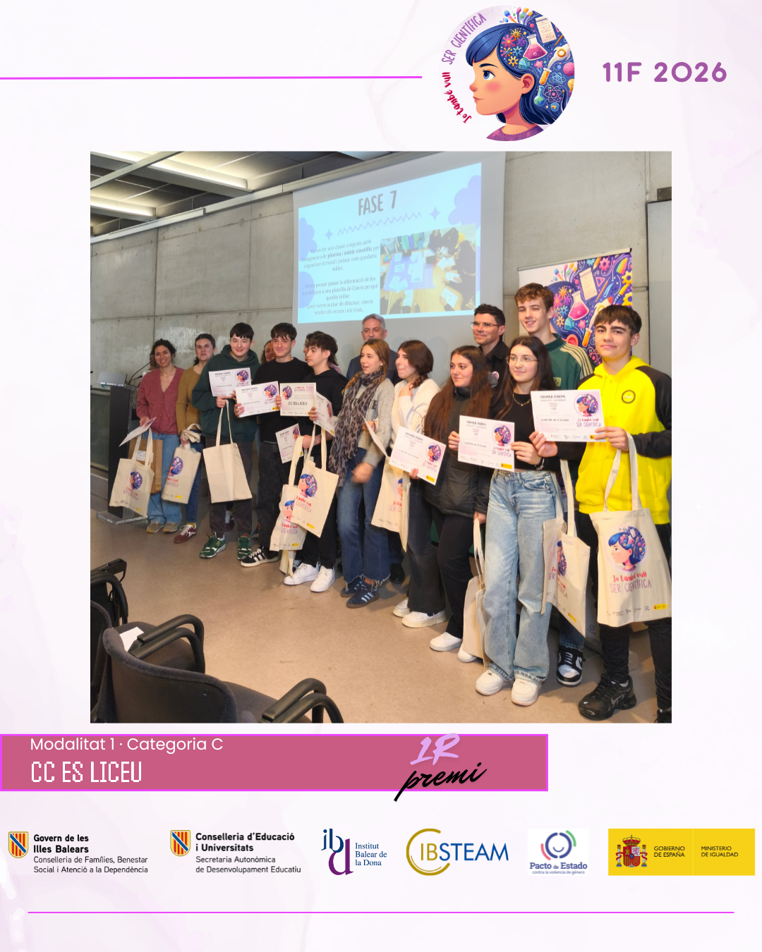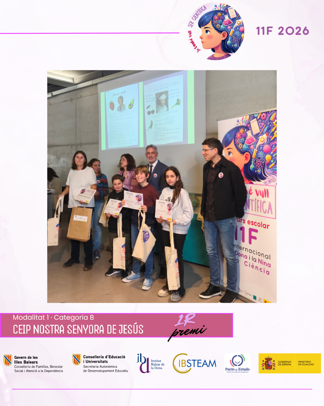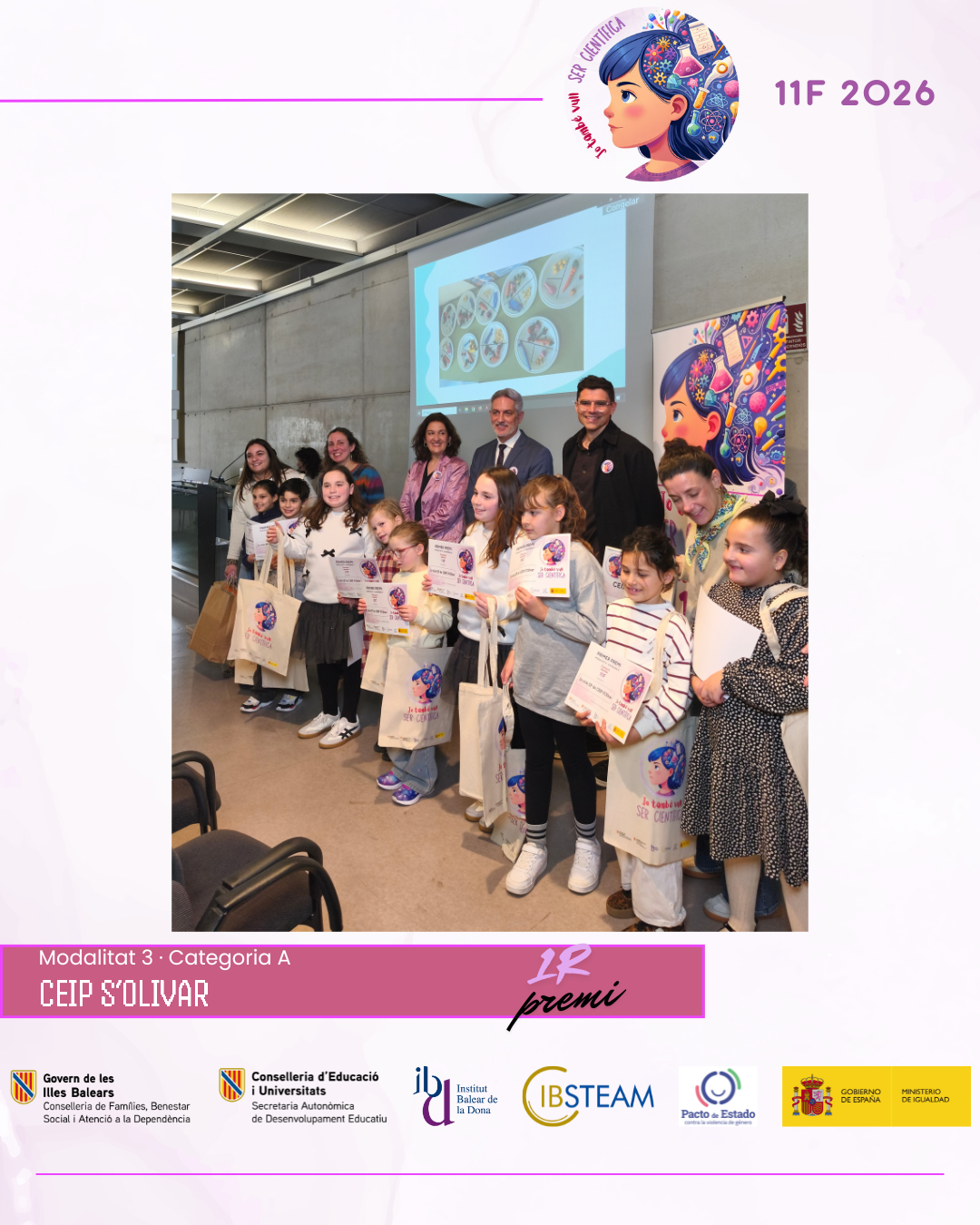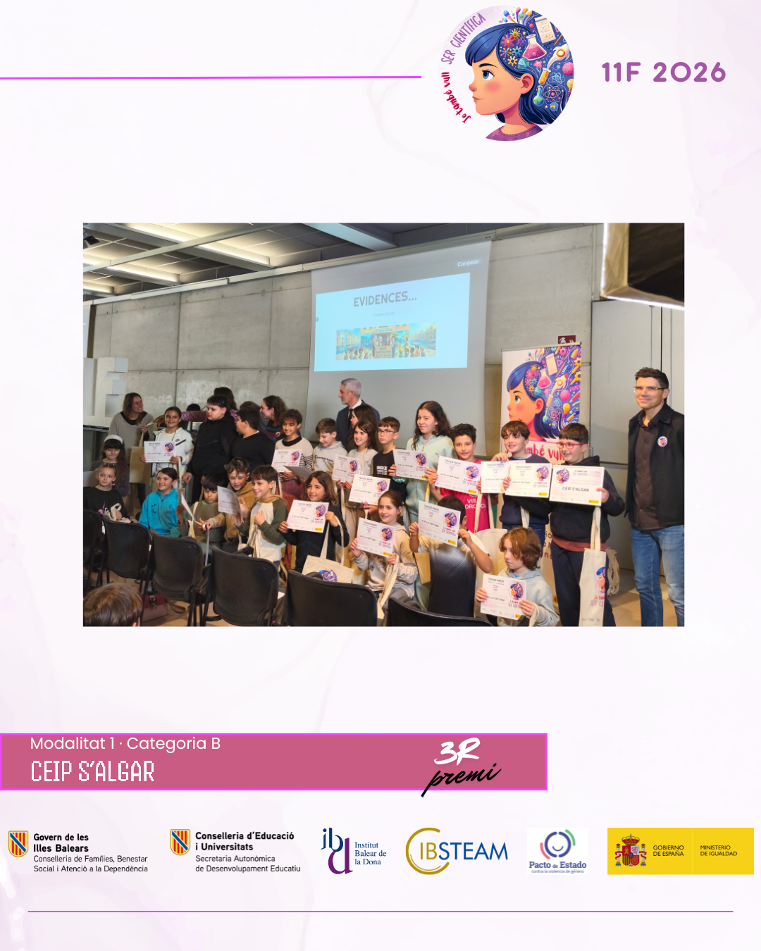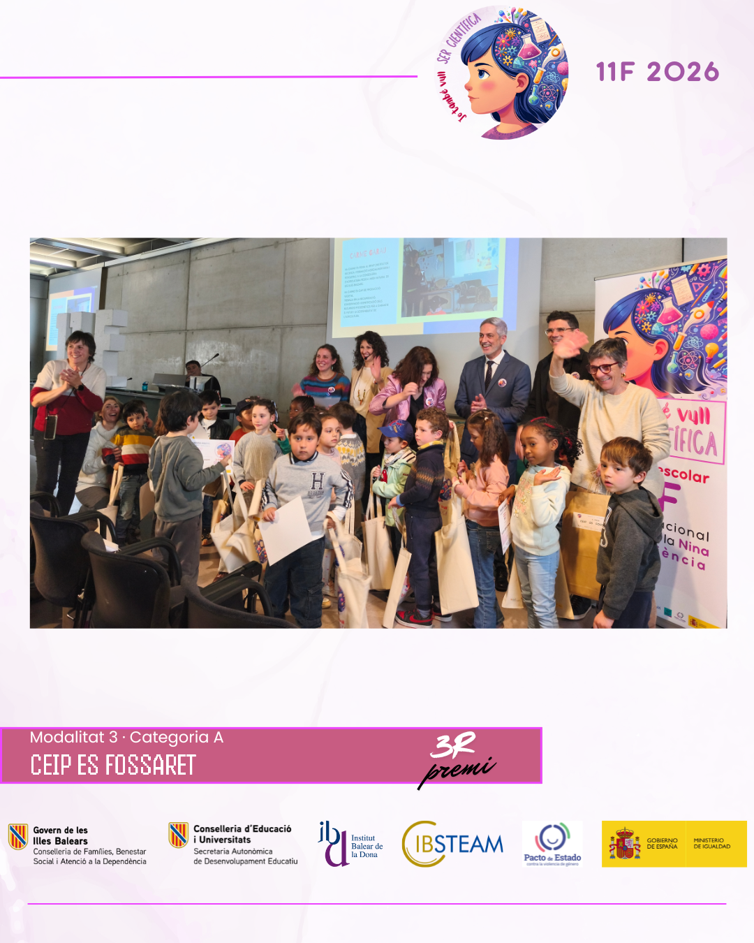 L’acte va reunir una nombrosa representació d’alumnat finalista i professorat en una jornada marcada per l’emoció, els aplaudiments i el reconeixement a la feina feta a les aules. L’edició d’enguany ha comptat amb la participació de més de 500 alumnes amb 74 projectes presentats per 28 centres educatius de les Illes Balears, amb alumnat des d’educació infantil fins a batxillerat, fet que consolida el concurs 11F com una iniciativa de referència impulsada per IBSTEAM per fomentar les vocacions científiques i visibilitzar dones científiques com a referents.