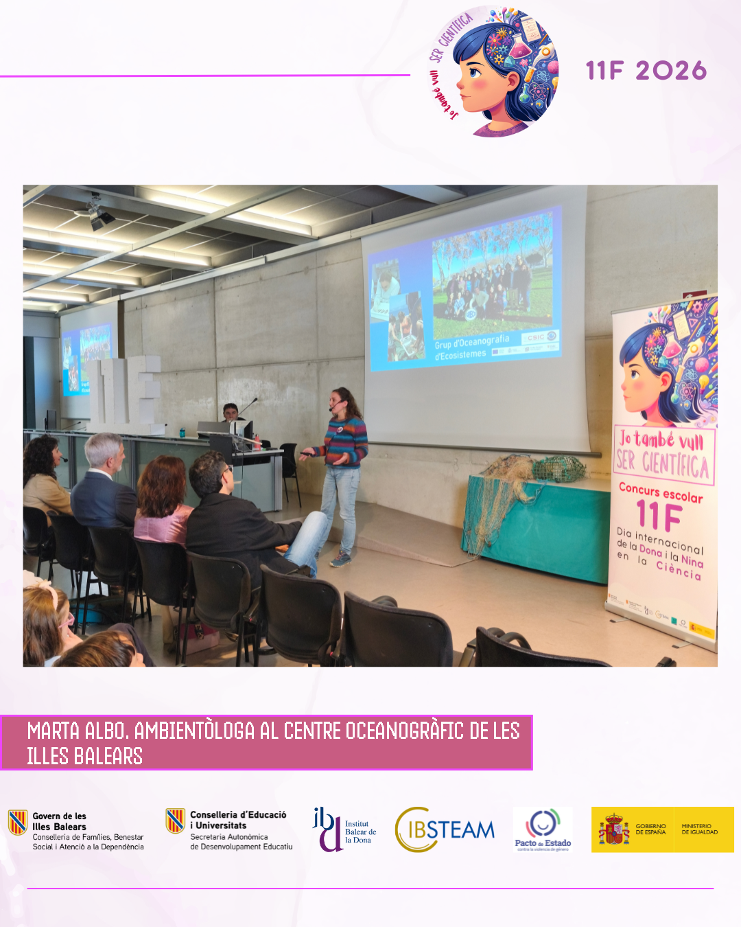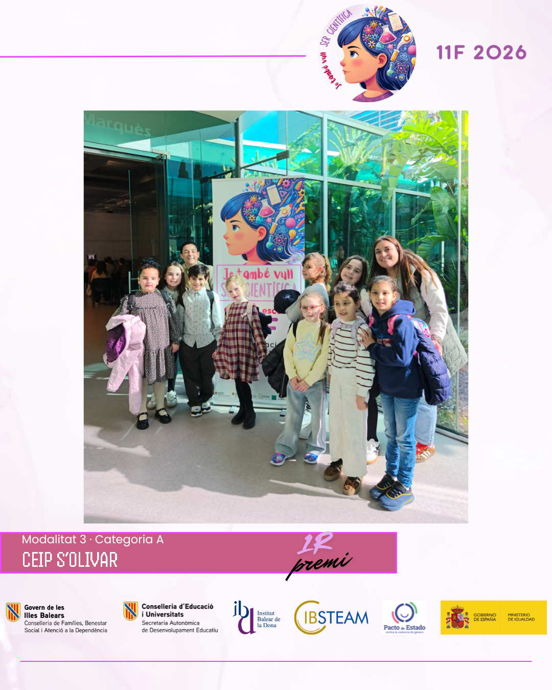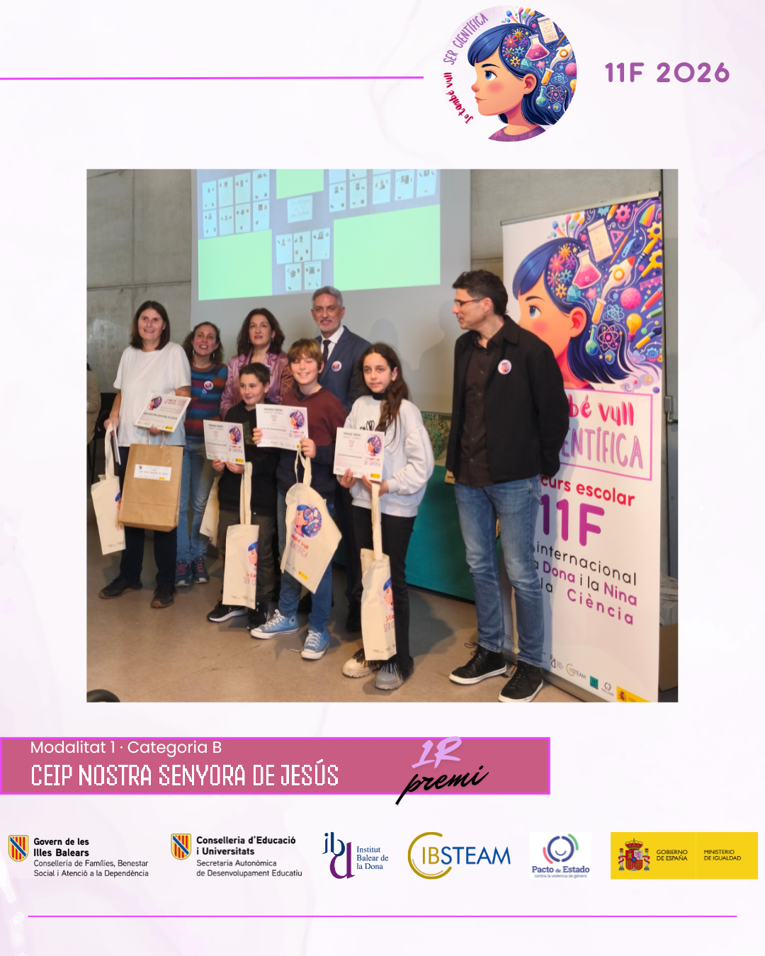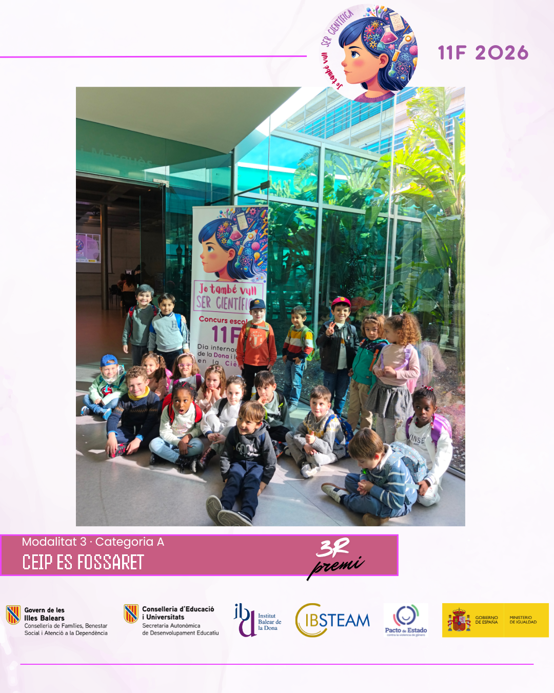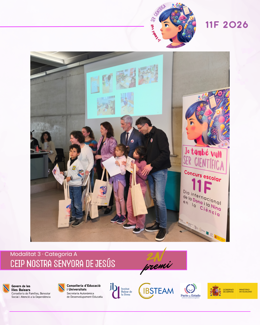 L’acte va reunir una nombrosa representació d’alumnat finalista i professorat en una jornada marcada per l’emoció, els aplaudiments i el reconeixement a la feina feta a les aules. L’edició d’enguany ha comptat amb la participació de més de 500 alumnes amb 74 projectes presentats per 28 centres educatius de les Illes Balears, amb alumnat des d’educació infantil fins a batxillerat, fet que consolida el concurs 11F com una iniciativa de referència impulsada per IBSTEAM per fomentar les vocacions científiques i visibilitzar dones científiques com a referents.
