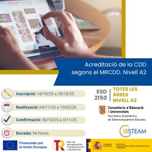 distància està destinada a docents en actiu, i acredita l’àrea 2 (nivell B1) i àrees 3 i 5 (nivell A2) del Marc de Referència de la Competència Digital Docent (30 hores).