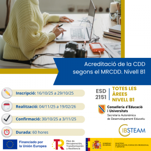 Aquesta formació està destinada a docents en actiu de centres sostinguts per fons públics de les Illes Balears i acredita les àrees 2 i 6 del Marc de Referència de la Competència Digital Docent en un nivell B1 (35 hores).